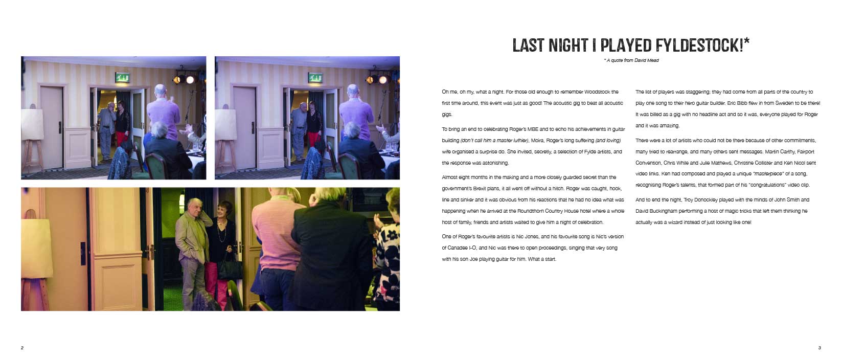 It was created to bring an end to celebrating Roger’s MBE and to echo his achievements in guitar building (don’t call him a master luthier), Moira, Roger’s long suffering (and loving) wife organised a surprise do. She invited, secretly, a selection of Fylde artists, and the response was astonishing.