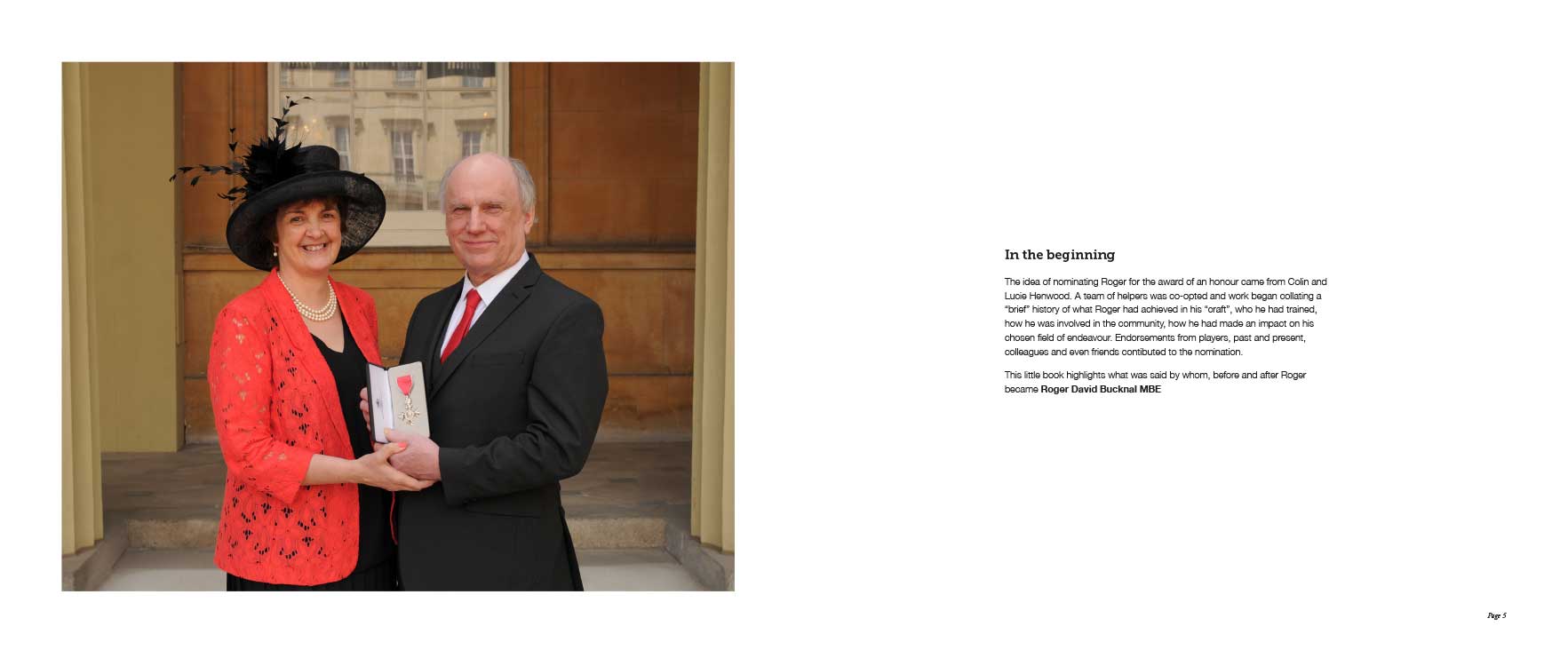 The idea of nominating Roger for the award of an honour came from Colin and Lucie Henwood. A team of helpers was co-opted and work began collating a “brief” history of what Roger had achieved in his “craft”, who he had trained, how he was involved in the community, how he had made an impact on his chosen field of endeavour. Endorsements from players, past and present, colleagues and even friends contibuted to the nomination. This little book highlights what was said by whom, before and after Roger became Roger David Bucknal MBE.